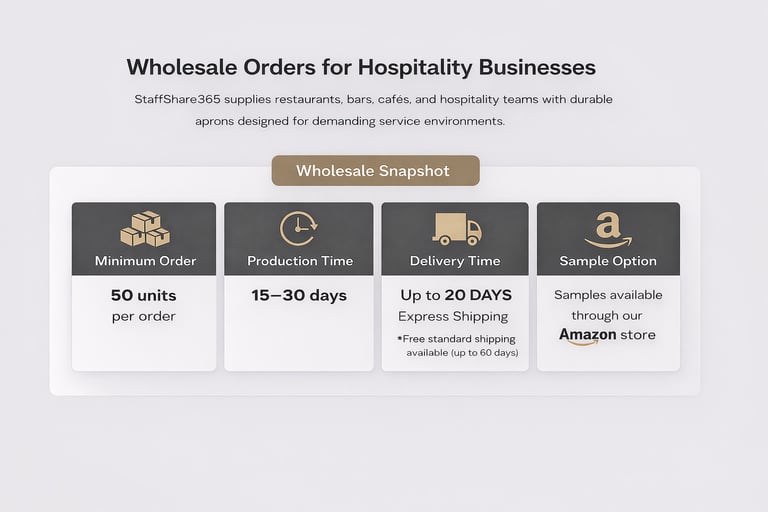 Restaurants, bars, cafés, and hospitality businesses can order aprons in bulk at competitive wholesale pricing.